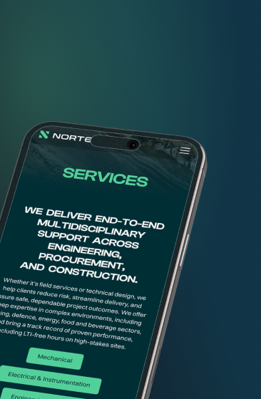 To complement the new identity, we designed and developed a sleek, contemporary website that captures Nortech’s forward-thinking approach. The site’s clean layout, professional tone, and strategic messaging communicate credibility while making it easy for clients to explore their capabilities and projects.