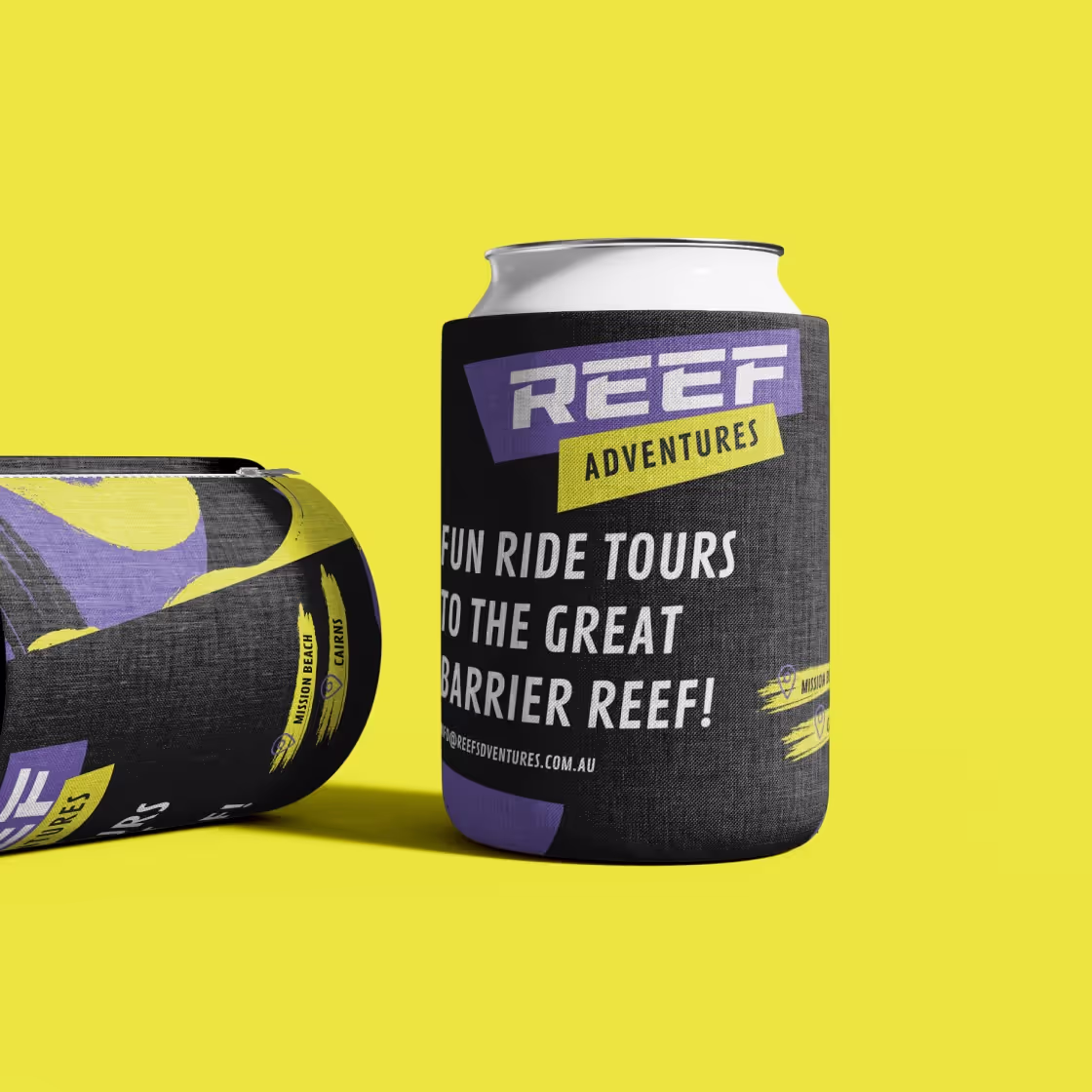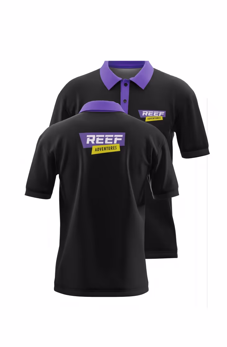 By selecting fonts that evoke speed and sportiness and creating a vibrant colour palette of yellow, purple, and black with dynamic brushstroke patterns, a visual identity was developed that captures the thrill of their fast-boat tours. The contrasting shapes and colours symbolise the winding water trails and the fun-filled journey to the reef, ensuring Reef Adventures stands out both on the water and in the marketplace.